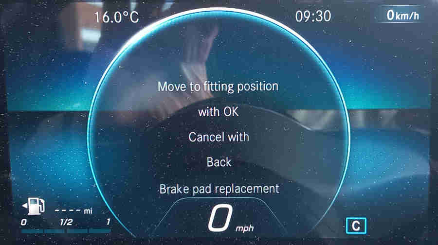 Click OK and the screen should display 'Moving to fitting position'. If you get 'conditions not met' a step has been missed or there is some other issue which can include battery not charged enough. Otherwise the actuators whirr for about 10 seconds i.e. much longer than for normal parking brake application or release which indicates they are backing all the way off, the parking brake icon flashes on and off :