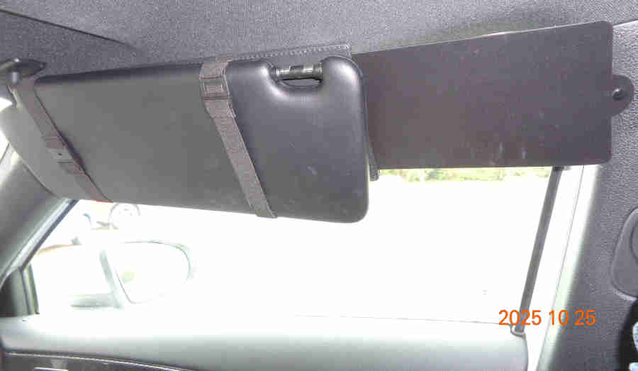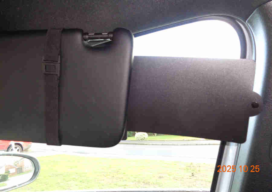 There are after-market gadgets that strap on and as well as extending to the side also have a section that pulls down for shorter occupants. Note some only extend downwards, and on those with both side and down extensions the down extension can either be tinted or solid - sometimes both types shown in the same ad but no facility to chose which one you want! Various prices from £5 to £20 delivered I go for the cheapest to try the concept. Adjustable elastic straps to fit over the existing sunvisor, reversible so the side extension can be made suitable for either side of the car, slid out using a tab on the edge. The correct way round puts the down extension tab at the bottom when lowered of course, but as I don't need that and it projects lower than the rest of the visor I turn mine over to put it at the top out of the way while still keeping the side extension in the right place. However due to the angle of the visor when out to the side the extension leaves a large gap above so as well as not shielding it hangs down enough to obstruct my side vision unless I crouch down: