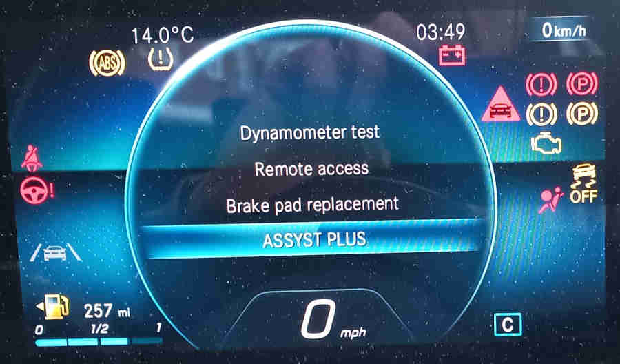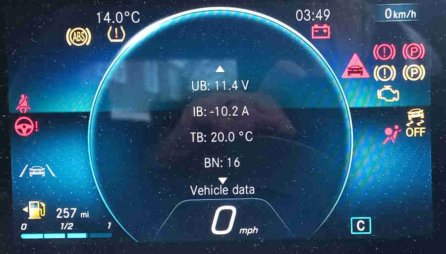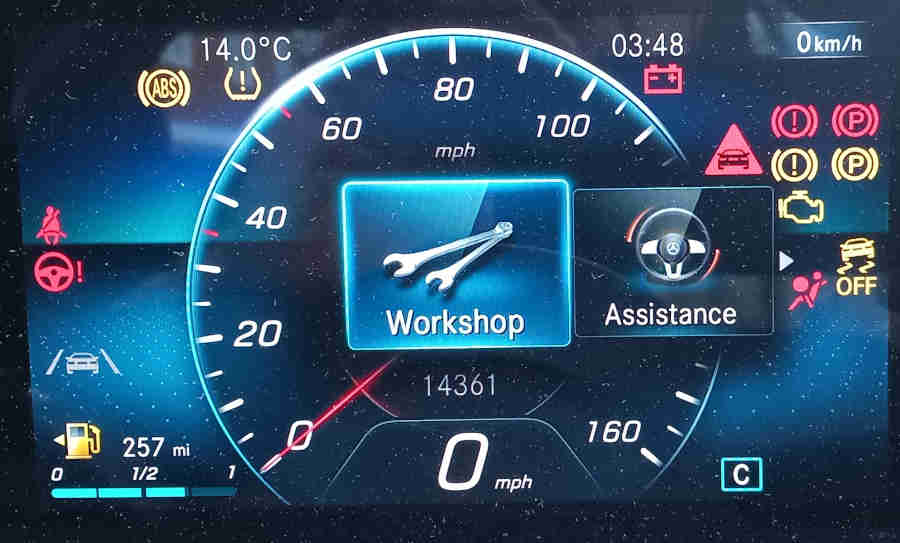 January 2026: Had a 200-miler over Christmas and normally that would be enough to suppress the battery warning for a couple of weeks. But just a week later - without using the car - up pops a 'Critical' warning on Mercedes Me. I presume the low temps from 1st Jan had triggered the warning early as it 'knows' a cold start will take more power than usual. Cranked over OK, maybe a fraction slower, and needed a couple more revolutions before it fired up. But once underway I had warning about traffic sign assist not working, limited camera functionality, and the 'skid risk' symbol coming up each time a wheel lost traction on the ice. About half an hour later I stopped at a postbox and after than the 20 mph symbol was flashing madly (it was a 20 mph zone) till I got back home.