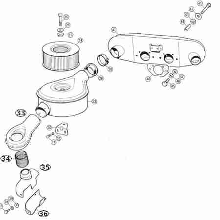 The metal tube on the inlet of the filter housing ('33') has the thermostatically-controlled flap above the flexible tube ('34'), which leads down to the shroud round the cast-iron manifold ('35', '36').