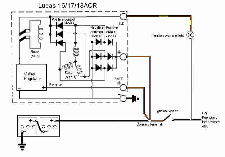 This relates to the Lucas 16/17/18ACR as fitted to the MGB, circuit elements have been copied form the Leyland Workshop Manual. There are many different types of alternator from many different manufacturers and the internal details can vary considerably.
