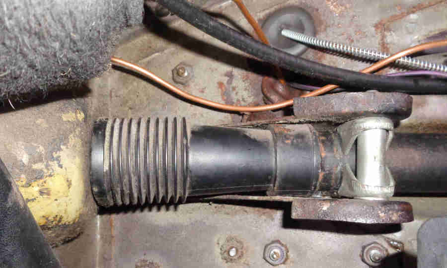 There is a flange on the seal (B) that protrudes through the clamping plate (A) then both are slid onto the end of the column outer. This allows the seal to be clamped to the bulkhead while the column can be moved fore and aft on its slotted mounts to line up with the column UJ: (Moss Europe)