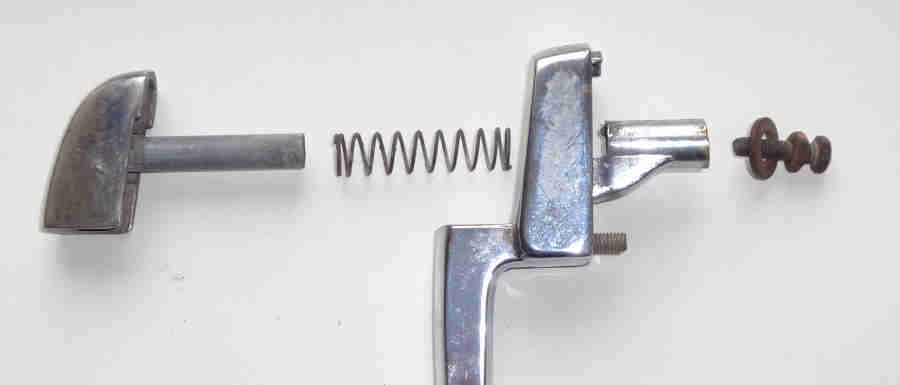 There is a return spring on the shaft of the button, and a screw, lock-nut and washer to keep the button in the main part of the handle: