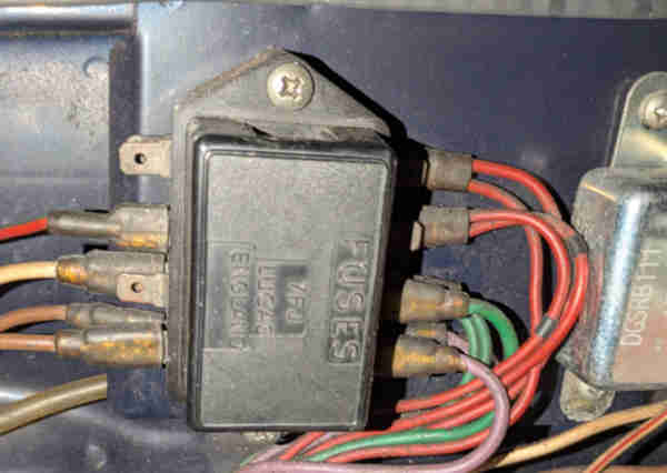 In 1970 this was changed to a 4-fuse unit with the additional fuses protecting the parking lights, one fuse per side. This fusebox only has two spades per fuse end, and to accommodate additional wires two were sometimes put in one spade connector.