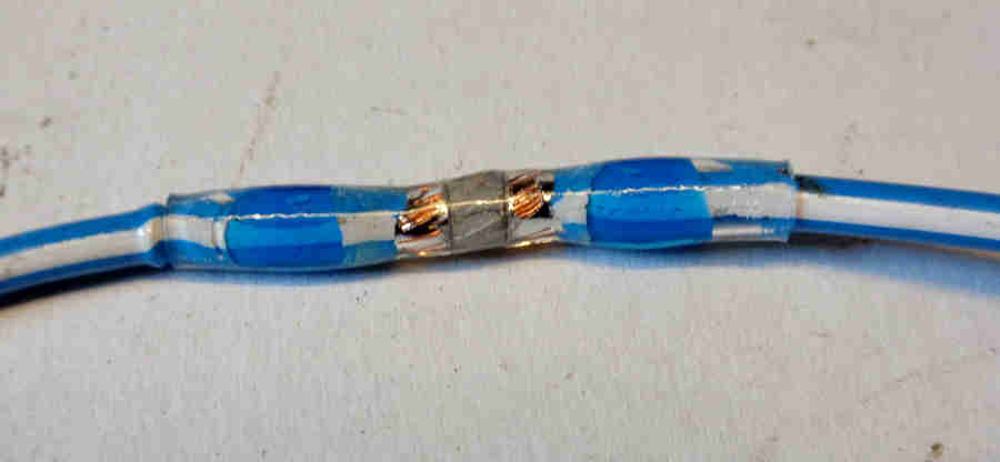 After-market solder-sleeves in white, red, blue and yellow for various wire diameters. A ring of solder in the middle for the electrical connection and two areas of adhesive either side of that for mechanical strength and sealing, for use with a heat-gun. I had wondered if the solder was a special low melting-point type but standard solder melts with my heat-gun as well: