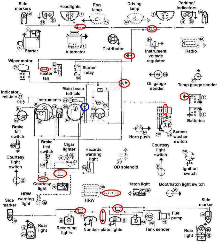 green 1 | green | fusebox brake light switch heater fan wiper motor voltage stabiliser reverse light switch hazard flasher switch screen washer motor HRW switch oil pressure gauge tachometer (12v) |