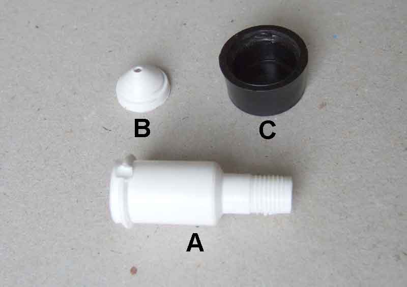 A new 12H6060/V8 breather, comprising a body (A), insert (B), and cap (C). It can be seen that the main part of the body and hence the cap are significantly bigger than the original items above: