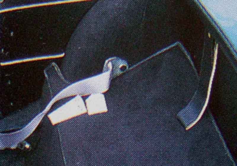 Both the above use the MGOC fitting kit (item 2), which includes the factory right-angle bracket BMH9512/3. Securon 514/30 belts can be mounted at virtually any orientation as they have adjuster knobs to ensure the mechanism works correctly. This means they can be mounted directly to the inner arch, but the belt then exits the reel vertically, which is less than ideal for its relative position to the seat and compromises retraction. Complicated still further by the presence of a commercial windstop, and a home-brew 'clip' to bring the buckle closer to hand when getting in the car and fastening the belts. (Michael Beswick)