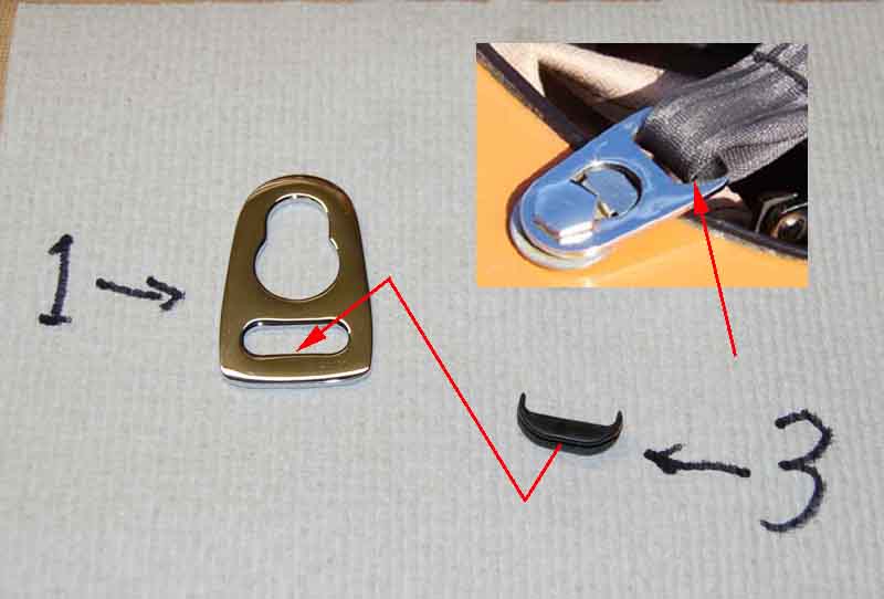 May 2015: And if that wasn't enough Jack Wheeler in America has discovered that there is a plastic insert - item 3 here - between the webbing and the chrome tongue, presumably to protect the webbing from fraying on the edges of the slot in the tongue. He is missing one and keen to replace it. Were these on all static shoulder belts? Or only on these 'quick-release' type? And if not on all statics, why not? One would think that the stresses on all belts would be the same, especially given that this type of belt is only unclipped by exception, and probably clipped back straight away.