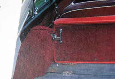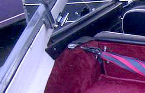 Bee's after-market inertia reels mounted in the post December 71 (North America) and September 76-on (other markets) position - on the arch right at the back and just above the chassis rail. The hole for these has to be drilled as there was no boss on the roadster wheel arch while the tonneau quick-release fastening was provided. Fitted in this position ...