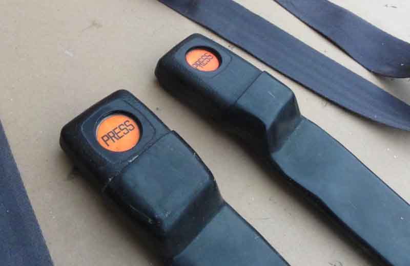 Originally the tunnel strap was floppy and needed two hands to fasten. A one-handed version for UK statics was introduced which consists of a stiff plastic sleeve over the floppy belt, which Vee has for her inertia belts, also over the bottom part of the sill section. Current replacements uses a stiff cable as for inertia belts.