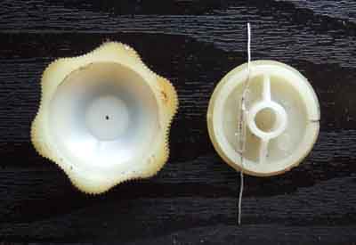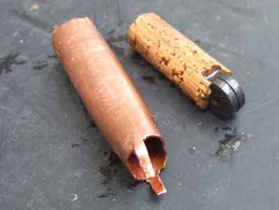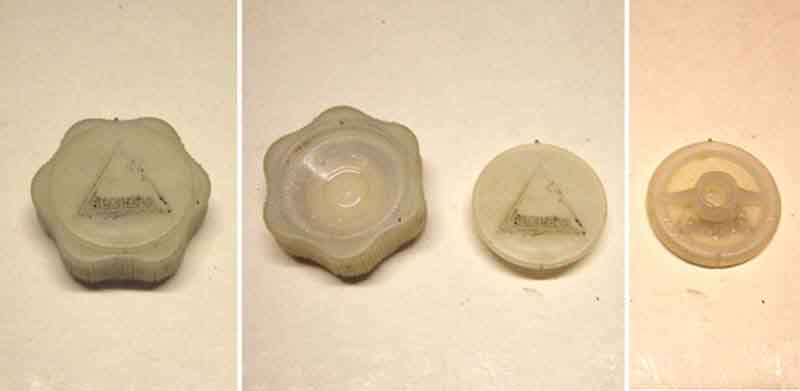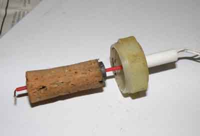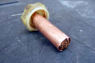 I considered various types of hollow container that might go through the filler hole, and cork. Attaching the tube but allowing it to move up and down was a non-starter as being too fiddly, but the cork was a possibility as a hole could be drilled through the middle for it to float up and down on a spindle attached to the cap. I wondered whether the cork would soak up fluid and become too heavy, so left one floating in a small container of fluid for some weeks, and it didn't seem to be sinking over time. However once I had fitted a spindle through it, it tended to stick to the spindle and not go up and down freely. Vibration from driving may well be enough to jiggle it down if you were losing fluid, but I wasn't that happy with it.