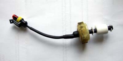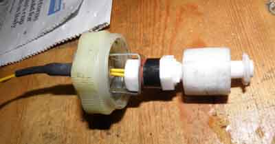 I've got two choices - I can either fit the threaded part of the spindle up through the main part of the cap and have the nut under the top cap, or I can fit the spindle down through the main part of the cap, and have the threaded part going through the top cap and the nut above that. Unfortunately not so easy, having set the float correctly so that it opens the reed contact when fluid level falls, I find that not even the lower position i.e. with the nut inside the two halves of the cap, does the float rise high enough to close the contact.