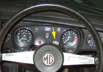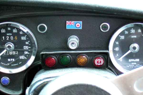 At one point I bought a couple of after-market warning lights - one with a brake symbol and one with an oil can for an oil pressure warning light. However they weren't very bright, certainly no good for the roadster with the top down and the sun shining, so didn't use them. But eventually I worked out how to prise the lenses out without damage. Underneath is a standard red LED (behind an red lens, orange behind orange for the oil) with dropper resistor to operate off 12v. These old-style coloured LEDs are not very bright at all, and the lens reduces it still further. Interestingly the led/resistor legs had two fine springs pushed onto them, and they fitted onto two spikes which came up from the external terminals of the light unit, making removal and refitting very simple - no soldering. So it was a simple matter to take a super-bright white LED and fit that instead without a resistor, which is inside the electronics module. With the corner of a bit of square, black plastic drain down-pipe I fabricated a mini-panel to hold both, which simply pushes into the gap between the dash and the crash-pad. Much brighter than before, it's only in full direct low-level winter sun that the light becomes less easy to see. Not a problem as that has an audible warning as well.