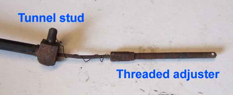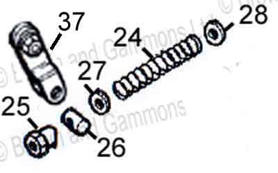 The trunnion (26) fits in the two holes of the handbrake lever (37) (it can fall out when removing or refitting the cable and roll some distance!), the threaded section of the cable fitted with a 1/4" x 3/4" washer (28), an expanded spring (24) and another washer (27) is passed through the fitted trunnion, and finally the adjuster nut (25) is screwed on: (Brown & Gammons)