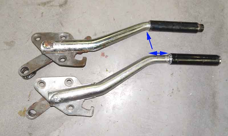 Two cabin levers posted by Colin Parkinson on the MG Enthusiasts forum. The top one is the 'short' lever where the tube bends right at the end of the grip, whereas the 'long' lever has about an inch of additional tube between the grip and the bend: