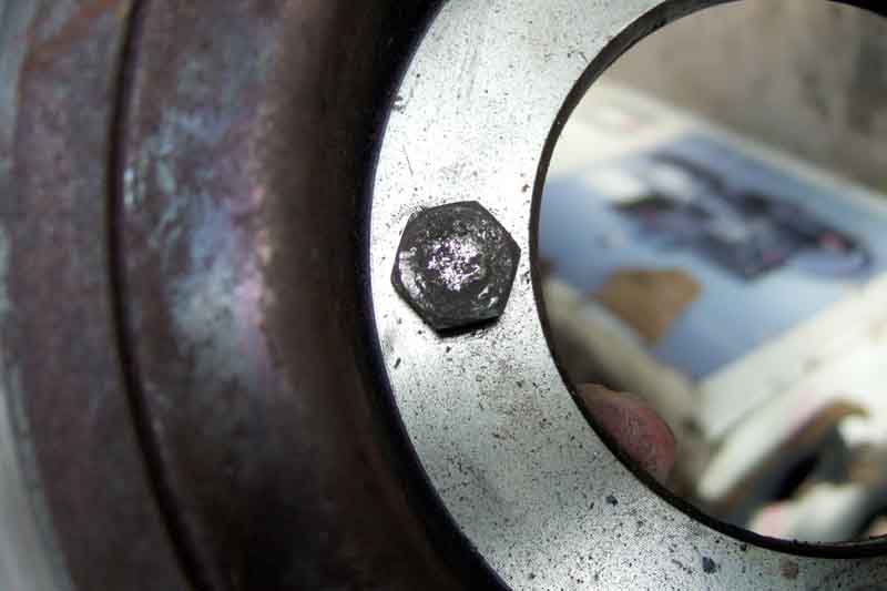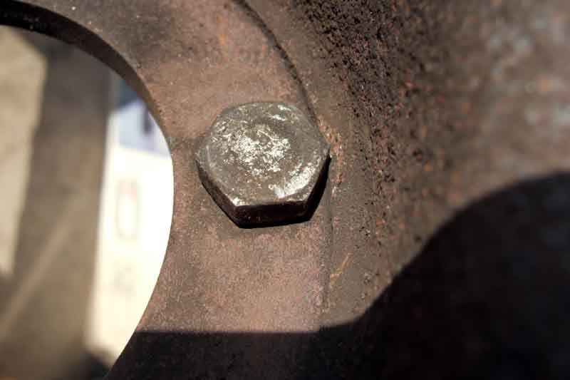 One of Bee's discs showing no clearance at all between the angle on the bolt head and the raised portion at the bottom of the well. This is a result of the flange being cast much thicker than it needs to be, so quite a lot of metal has been machined off, but not out to the wall of the well. This leaves a step on the flange which significantly reduces how far a socket can go on the head and also puts it an angle, making it very likely to slip off damaging the head in the process.