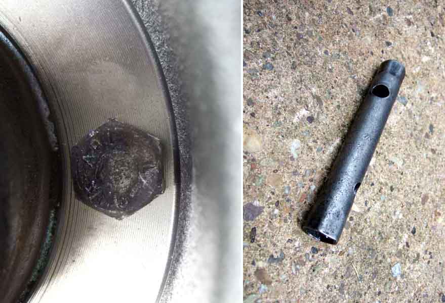 Using 'ground effect' to assist in undoing the nuts and bolts. All the bolts turned before the nuts cracked loose so I had to have a socket either side. That on the bolt head needs to be kept as square as possible and pushed onto the head as much as possible as the socket only fits on about half-way due to a step on the disc flange. When I knew I was going to do the same job on a pals car I got hold of a large bench vice which I was able to use to grip the disc while my pal pushed the socket/box-spanner (see below) onto the bolt head while I used a breaker bar on the socket.