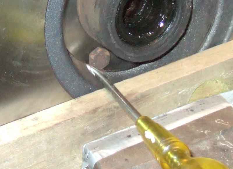 The new disc has a larger clearance, but still isn't enough for a socket to fully seat. However a box-spanner (inherited from my Dad, been in my toolbox unused for probably 40 years) did when the bolt head flat was aligned as shown, as the box-spanner is only 0.747" across the flats externally whereas my sockets are 0.809" OD.
