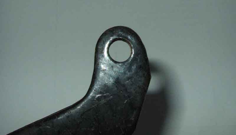 But looking at Steve's pedal I realised that all the wear is to the right, which means originally the hole would have been considerably off-centre, whereas I remember Bee's (with the wear removed) and two spare unworn pedals were central. This is one of the unworn spares showing that, but it also shows that the left-hand side of the hole is about the same distance from the left-hand edge of the pedal in both cases, so Steve's pedal must be much wider than mine at that point. Not only that, but this hole is nearer the top than Steve's is, which if the pedals have the same distance from the pivot to the top means that Steve's will have less leverage and hence less 'throw' than mine: