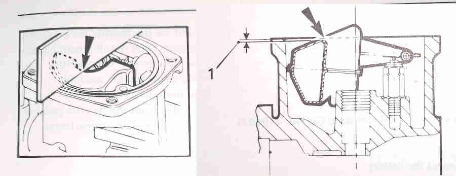 HIF: Lay a straight-edge across the middle of the body of the carb in the curve of the float. There should be a clearance of 0.5 to 1.5mm between the two at '1' below. John Twist at 2:10 here says if the weight of the float compresses the spring in the valve then the carb must be tilted so the spring is uncompressed. The WSM only says to " ... invert the carburettor so that the needle valve is held in the shut position by the weight of the float only", nothing about springs. Some valves have springs and some don't, and the effect of a compressed spring would be a lower fuel level in the float chamber: