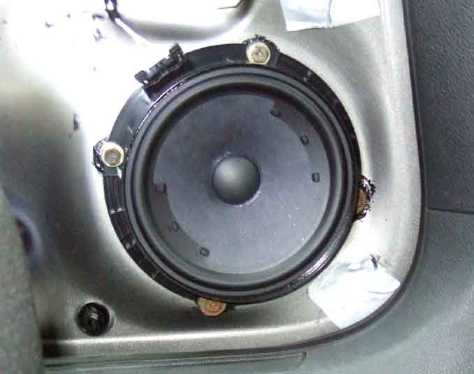 New speaker fitted, duct tape over the holes for the clips ready for a test with water. If only they had put a smaller version of that large triangular closing panel - which obviously keeps all water out - in the speaker hole, with a recess for the back of the speaker, water would have been kept away from the speaker so cracks in the mounting flanges wouldn't have been a problem: