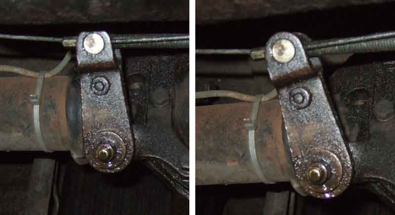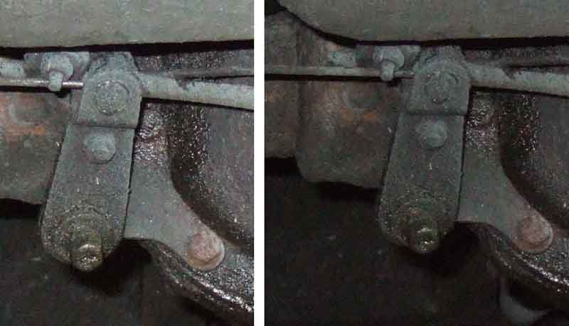 If the 7/16" washers are too thick, or a 7/16" washer is used in the outer position in place of a 5/16", tightening the nuts will quite likely jam the compensator lever in position preventing the off-side wheel being braked by the handbrake, or even worse locking it on. If slackening the visible nut frees the compensator up (some have said theirs does have to be slackened) then that is what has happened. The same will happen if the compensator bush is seized to the link pin, but in that case only if the nut behind the bracket is left slack will the compensator be free to move, which allows the link pin to wobble about in the bracket wearing both parts.