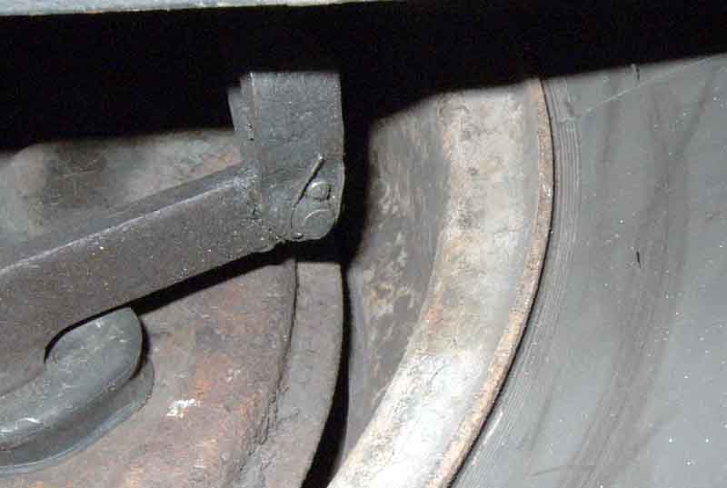 Showing the rubber flap attached to a flange on the axle casing, to which a bracket on the handbrake cable is attached. The rear pivot and mounting for the anti-roll bar can be seen on top of the axle casing (top left), but other than both being attached to the tube in adjacent areas the two are entirely separate.