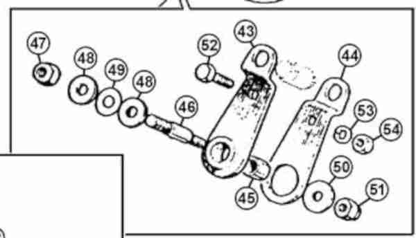 Compensator components as shown by Moss Europe (Brown & Gammons and the Leyland Parts catalogue drawings omit several washers). The two halves of the compensator lever 43 and 44 are clamped together by the screw, lock-washer and nut 52, 53 and 54 around the trunnion (shown faintly between 43 and 44 and should be free to pivot) on the cable outer at one end, with bush 45 at the other end of the two halves. This assembly should then pivot freely on the 'link-pin' 46 when the stiff-nuts 47 and 51 have been tightened: