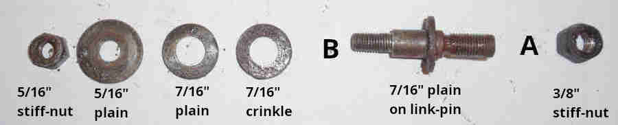 Not even that shows the full story though as using the key and part numbers the parts are shown in the wrong places. The larger thread on the link-pin screws screws into the diff bracket positioned at 'A' the plain section flush to the bracket, with the larger 3/8" stiff-nut LNZ106 behind it as a lock-nut. One of the larger 7/16" plain washers GHR303 has been slid onto the link-pin ready for the lever assembly and bush which goes on next at 'B'. Then the 7/16" crinkle washer AWZ107 and other 7/16" plain washer go on the plain section of the link pin, then the 5/16" plain washer PWZ205 butts up against the shoulder on the pin, and finally the 5/16" stiff-nut LNZ105: