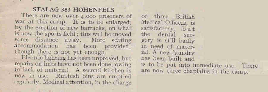 July 2022: Following our tour of the Dunkirk rearguard actions I was preparing to take information from that for our grandson, who has a great interest in military matters. My wife inherited a collection of paper and photos from her parents and going through that for photos of Harry in his younger days I was reminded that The Red Cross regularly sent news from the camps to families of POWs in a newsletter The Prisoner of War. I'd never read them in detail but just glancing at them spotted a couple of things referring to Stalag 383 which I reproduce below. There was also information relating to the Polish Stalags, where Harry was originally, but unfortunately I haven't been able to find out which one.
