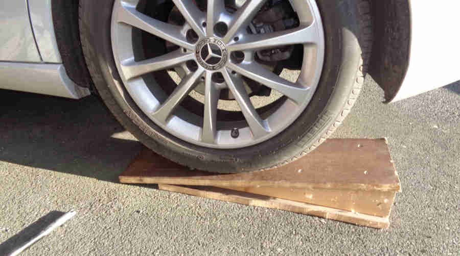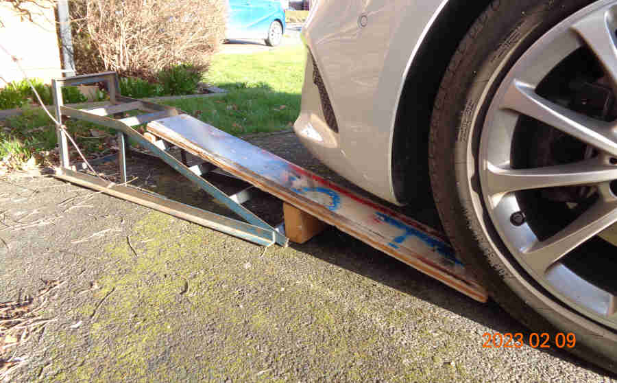 Concerned about driving off the back of the ramp and flipping it up to damage the underneath of the car I'll probably have to use the metal ramps with the pre-ramps, but even that is marginal given the closeness of the front quarters to the ground and the distance to the wheels: