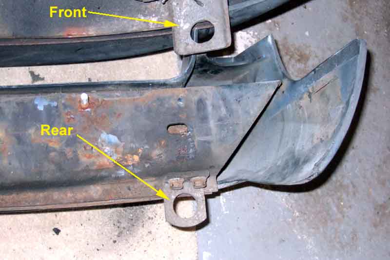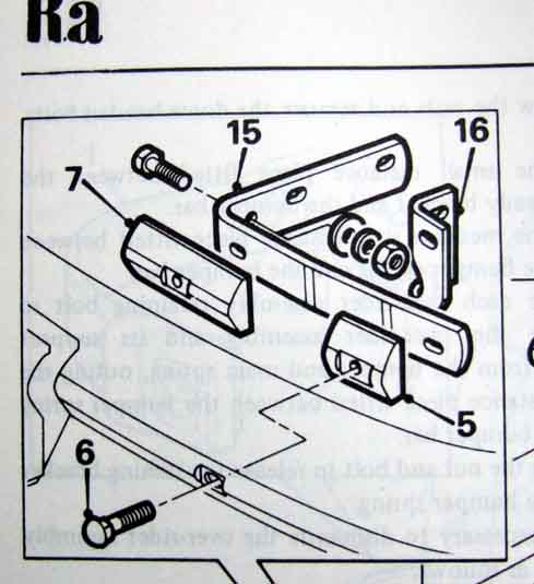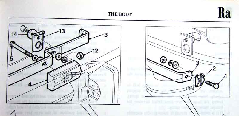 There has been debate about just how they were fitted i.e. whether they went on the chassis rail bracket before or after the bumper spring, with the tab resting on top of the spring. This again from the Workshop Manual on 'Sabrina' overriders shows flat ones fitted to the chassis brackets before the bumper springs: