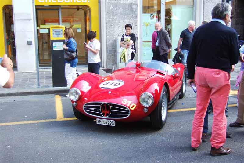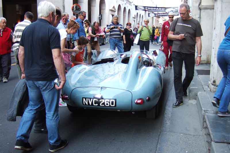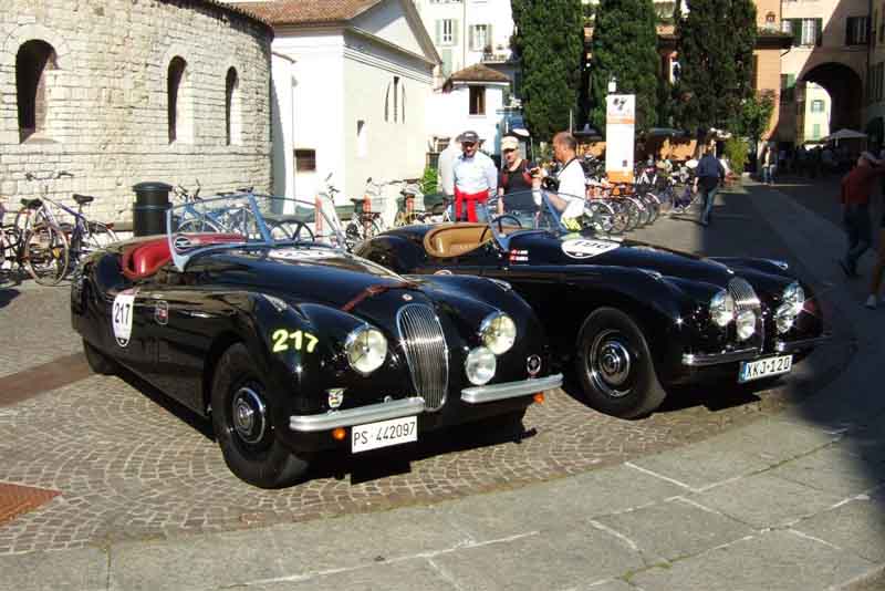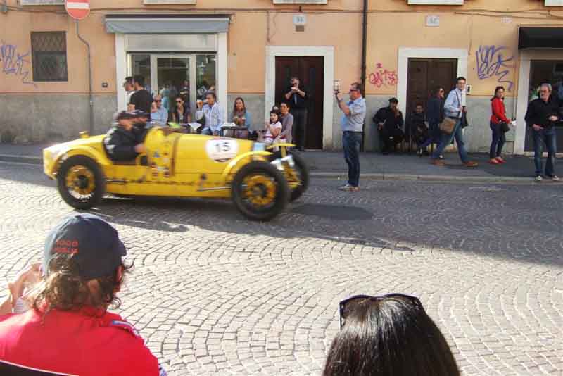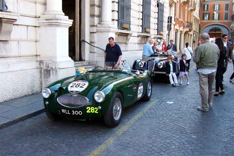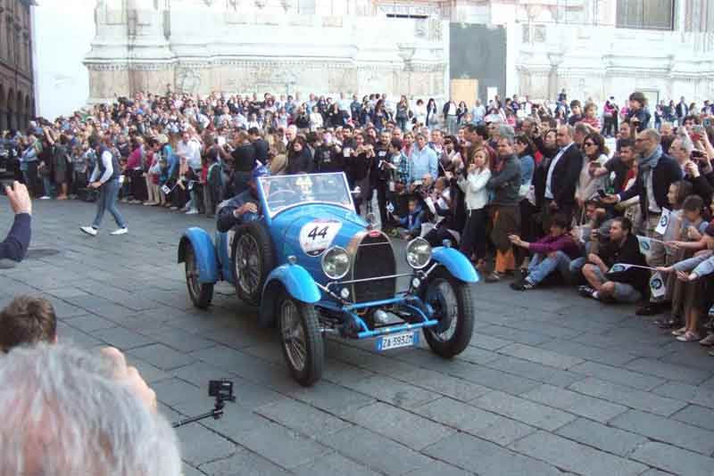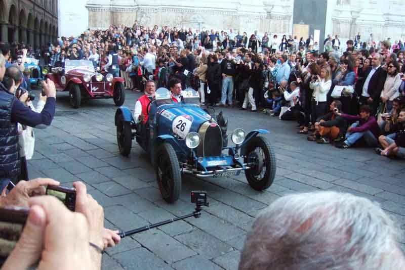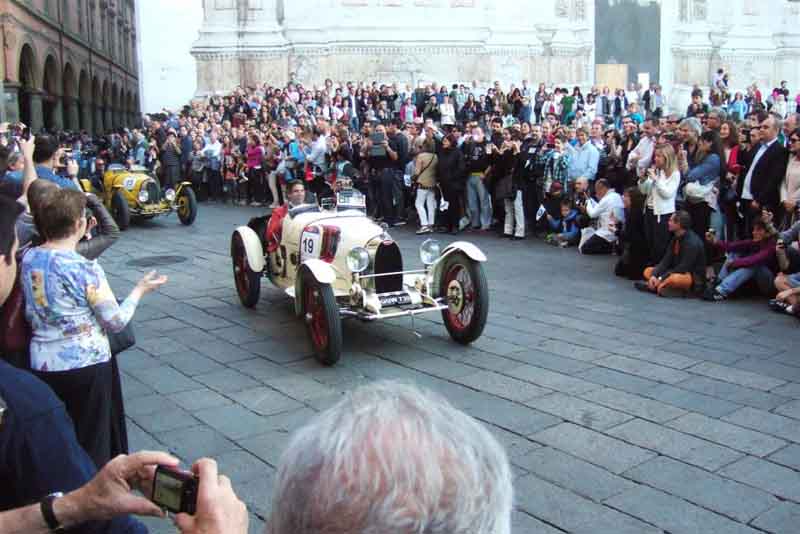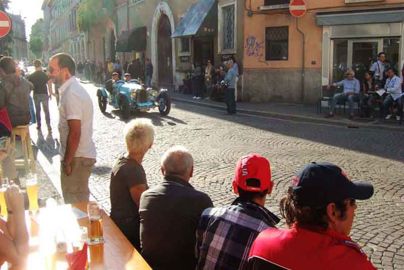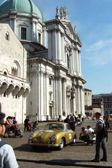 Brescia before the start, cars dotted around the piazzas and surrounding streets.