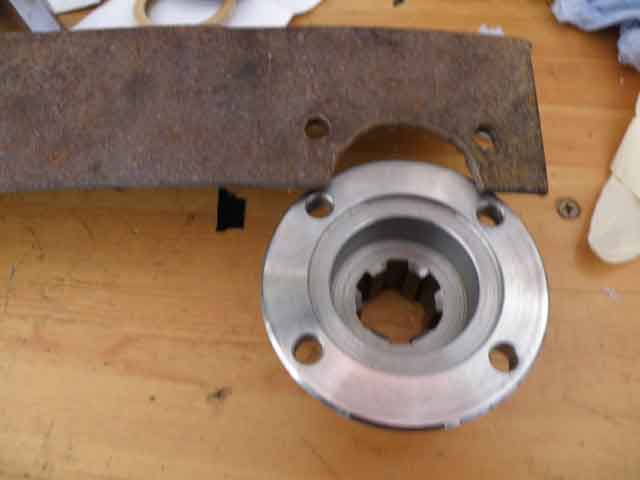 New flange and seal, together with a wooden ring originally intended to be used to drift the new seal into position but not used