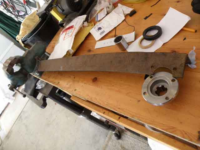 The 'tool' used to hold the drive flange steady while the central nut was undone - a piece of 2 ½" angle iron, with a curved section cut out and 2 holes. The flange nut is 1 1/8" AF, same as the front hub nuts.