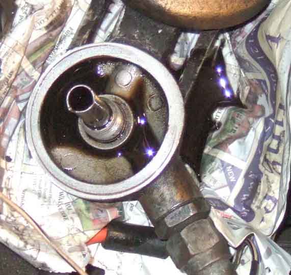 Next possible trauma - the oil cooler hose. An adapter between that and the filter head, with a 9/16" Whitworth hex on the hose connection, and fractionally smaller than that on the adapter. I only have one 9/16 and a Metric spanner which is slightly larger. With the spanner on the hose fitting Sod's Law dictates it is the adapter that comes free first. No big deal, I'm removing the filter head so could unscrew it from the hose. But the 'start' on the new one is quite likely to be in a different place, meaning the cooler hose would be under torsion, and in any case the replacement filter head has its own adapter already fitted. But with the 9/16 on the adapter, and a penny in the jaws of the metric spanner makes that a snug fit on the hose fitting. Squeeze the handles together between my two hands (avoids putting stress on the adapter or filter head) and the hose fitting comes free. Remove that and tie it up out of the way to stop it dripping. With that off and the bolt removed the old filter head comes free with a bit of wiggling.