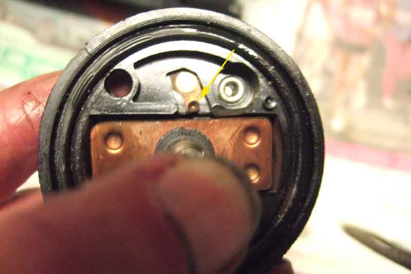 Vee's replacement starter: A copper bar bridges the two stud contacts A and B when the solenoid operates and is supposed to connect power to the small coil boost contact as well. But that contact (arrowed) is bent back ...