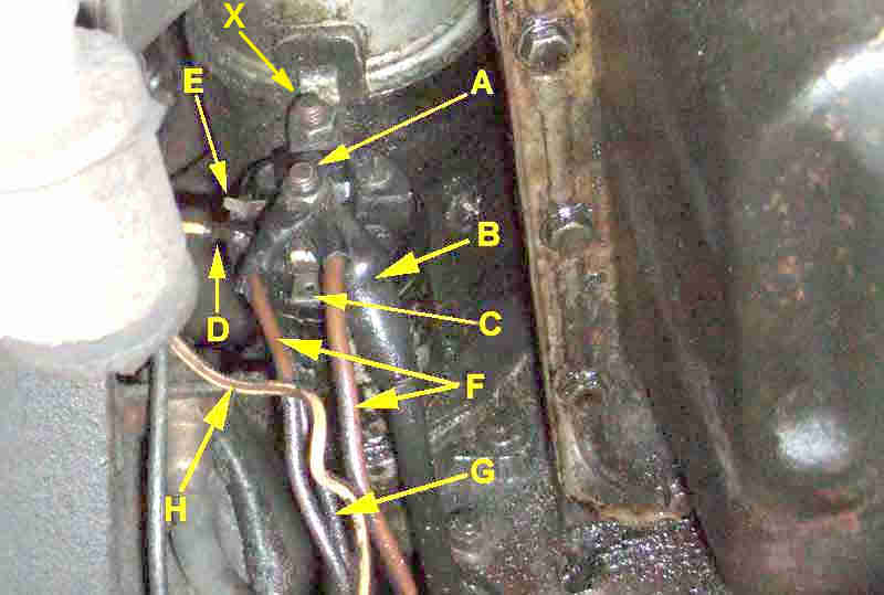 In practice: 'A' is the battery cable stud, 'B' the battery cable, 'C' the large spade for brown wires as used originally. 'F' are the brown wires to the cars electrics and the output from the alternator, 'G' is the additional smaller gauge wire to the alternator on cars that used battery sensing. 'D' is the solenoid operate terminal and 'H' the solenoid operate wire, 'E' is the coil boost terminal only used on rubber bumper cars and V8s. 'X' is the output stud of the solenoid with the nut clamping a copper strap leading into the motor: