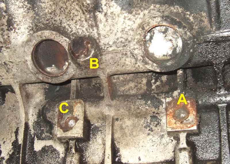 At least one person has said his block doesn't have a tapped hole for the fixing bolt, but both my original and an engine from elsewhere both have it. 'A' is the lower mounting point for the engine mounting plate, 'B' is the block drain plug, and 'C' is the hole for the heat shield: