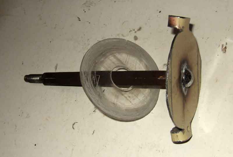 Wire-wheel clamp fabricated from an old Ron Hopkinson rear ARB drop-link, a 3/8" UNF threaded section welded to one end of that, and a clamp-plate with 'wings' and plastic protector fitted to the other end: