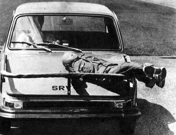 The final SRV car was based on the Austin/Morris 1300, perhaps an odd choice in view of how close the car was to the end of its production run at the time. It was, nevertheless, the most adventurous of the SRV prototypes, featuring a spring-loaded (and rather thinly-padded) pedestrian-catching cage which was activated in the event of an impact. Thus, it would be raised from its dormant position atop the front bumper in order to prevent the accident victim from sliding down into the path of the car's wheels. Well, that was the theory, anyway. This unique feature is amply demonstrated in the above photograph, which also shows the car's steeply drooping nose to good effect.