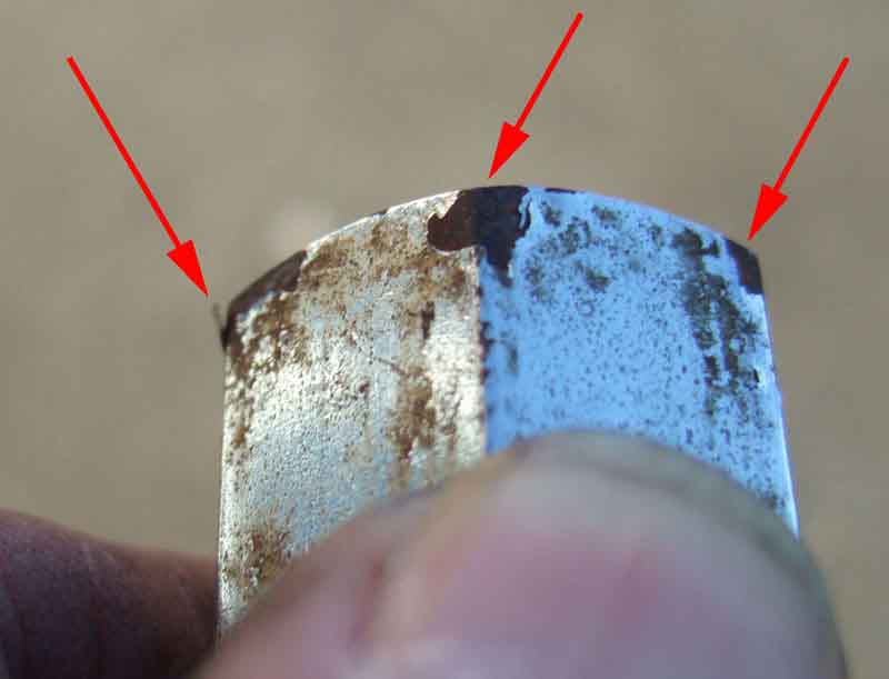 The peeling (arrowed) nut and the worst washer - clearly not stainless.