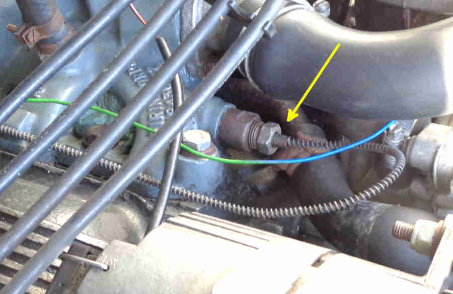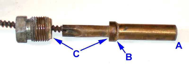 The capillary sender - 'A' is the bulb that projects into the coolant under the thermostat. 'B' is the tapered seat on the flange that butts against the head. 'C' are the flat faces on the back of the sender flange and on the nut, the nut presses against the flange which presses the tapered side into the head to form a seal: