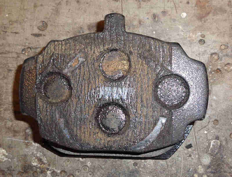 V8 pad with V8 caliper and disc. Both discs are 273mm diameter, but note the narrower 'channel' between the inner edge of the pad surface and the hub, which gives the wider pad area. V8 discs are thicker and won't fit the 4-cylinder calipers with new pads: