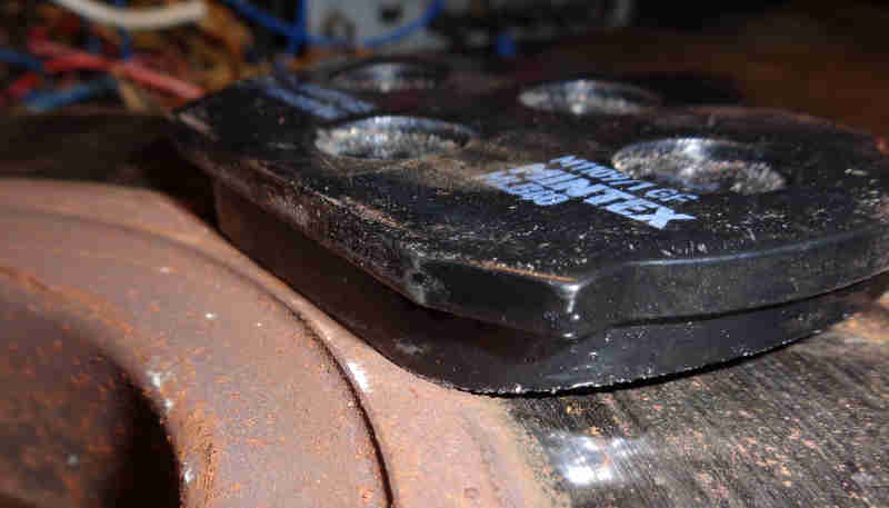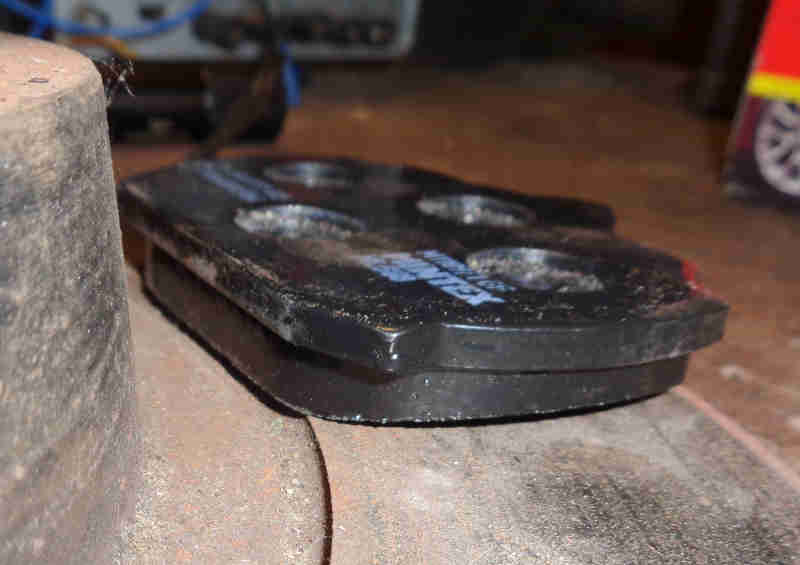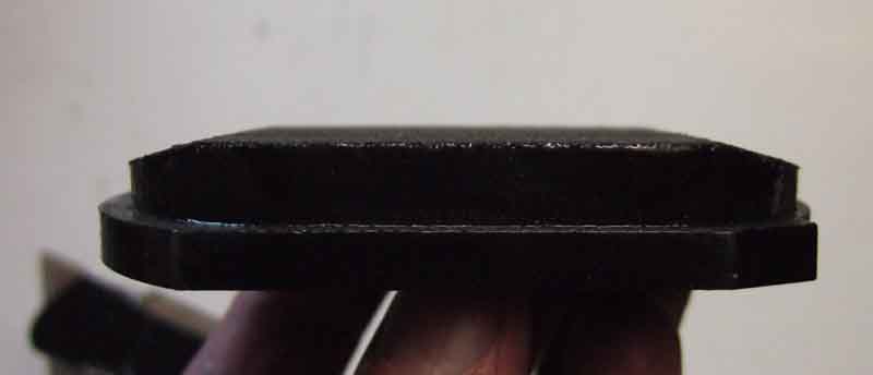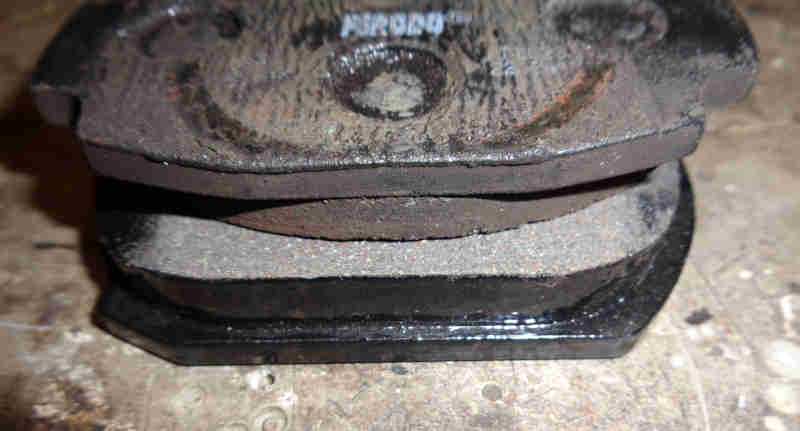 V8 pad on 4-cylinder disc: On the outer face of the disc some of that extra material is not doing anything and as the pads wear that unused part will lodge in the recess in the disc meaning the piston will have to be retracted more than usual to remove them: