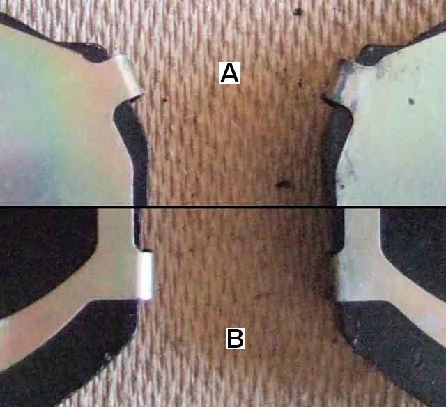 Note also that the shims are handed - the tabs at A and B are at different angles. This means that they only go on one pad each side, as well as each pad only going in one side of the caliper. After 20 years I only recently wondered how the cut-outs in these shims were orientated relative to the cut-out in the caliper piston, which has to face the spindle. I soon realised that with both shim and pad being handed there is no room for error, but it does mean the cut-out in the piston is at right-angles to the cut-out in the shim, resulting in a rather complex force of the piston on the pad, and - from back pressure of the pad on the disc - of the piston in its bore.