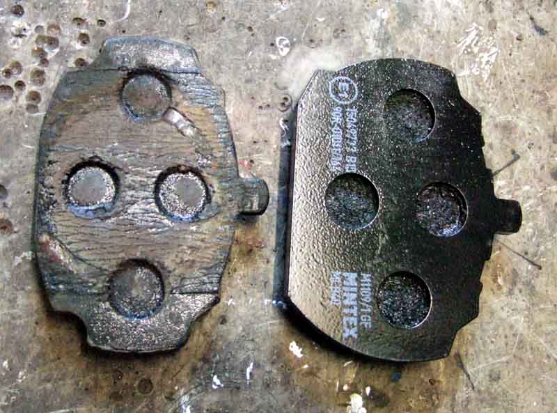 In the above pictures of the V8 pads the apparent gap between friction material and disc is due to the chamfering on these new pads, thought to be in response to squeal: