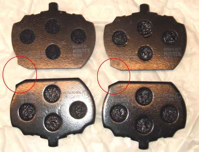V8 pads are handed - there is an inner and an outer for each caliper, the 'handing' can be seen as a sticking-out bit on one inner corner of each pad, circled. Below shows a pair for one caliper on the left and another pair on the right. Both pairs are the same, which may seem to be incorrect, as the pad that goes in the outside half of the caliper one side of the car goes in the inside half of the other! That puts the circled sticking-out bit on each pad in the same position in each half of each caliper.