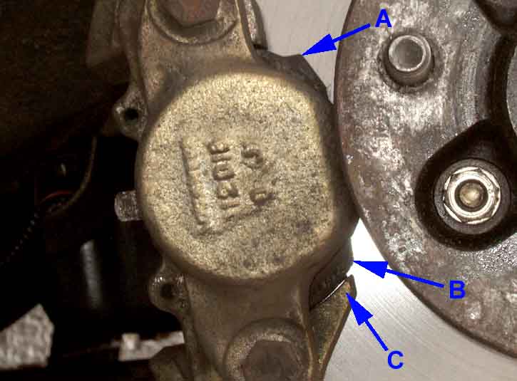With the pads fitted you can see the sticking-out bit uppermost (A), and the curved corner at the bottom (B). You can also see how a protrusion on the lower caliper bridge (C) is what prevents the pads being fitted the other way round: